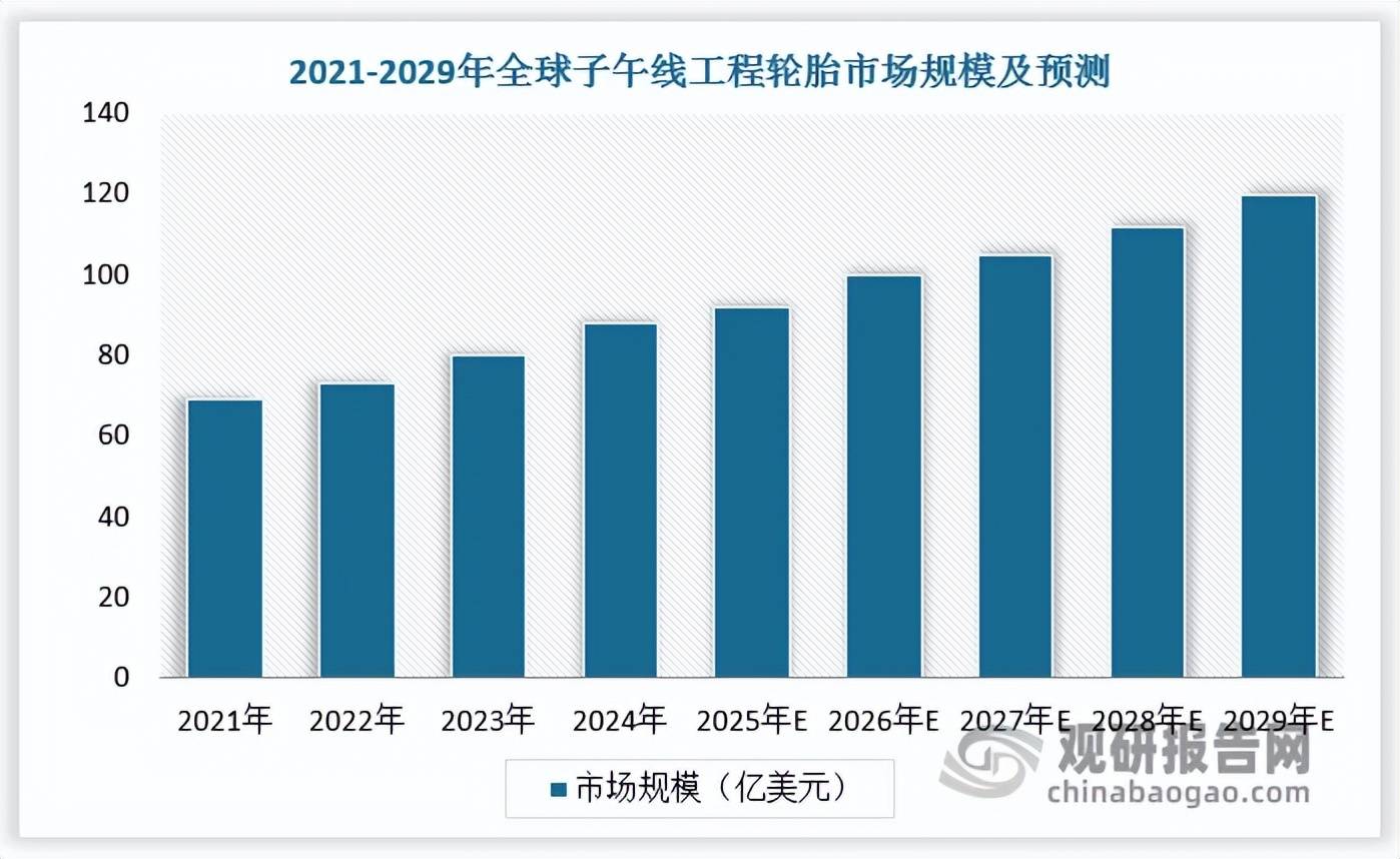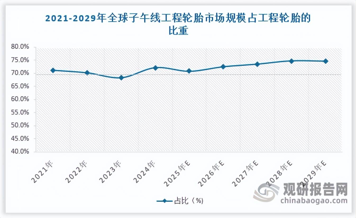 轮胎按照布局可划分为子午线轮胎和斜交轮胎。此中子午线布局是轮胎工业的性冲破,其“刚柔并济”的设想(胎体柔韧、带束层刚性)完满均衡了承载、耐磨、节能等需求,是矿山开采、基建施工等沉型功课的焦点保障。子午化为工程轮胎行业次要成长标的目的。占工程轮胎总市场规模的比沉达68。4%。估计2029年全球子午线亿美元,